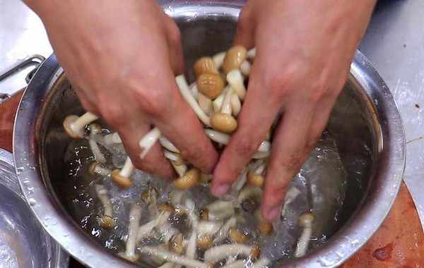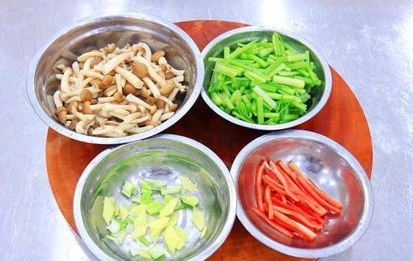 1.准备一把新鲜的蟹味菇去除根部,放入清水中多抓洗两遍,把上面的杂质和灰尘洗干净,芹菜用的是小香芹,没有老筋吃着更加清爽,把比较大的芹菜从中间划开,切成段洗干净备用。