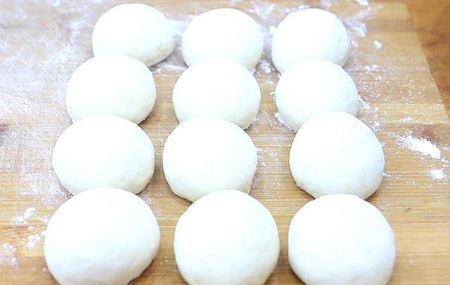 4.面团发酵好后,在案板上撒上底面,取出面团搓揉排气,搓成长条再切成大小相同的面剂,每一个面剂都搓揉一下,搓成圆面坯放在一起,放置松弛一下,用白细布盖住,防止面坯风干皮起皱。