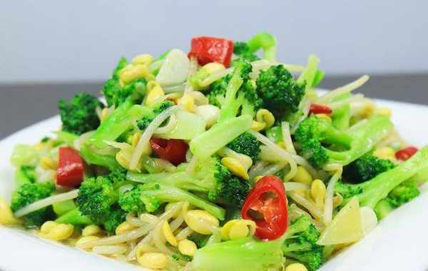 3.锅内烧油,倒入葱姜蒜和小米椒快速翻炒出香味,倒入黄豆芽翻炒1分钟左右,开始调味:加入食盐2克,鸡粉2克,鸡精2克,快速翻炒化开调料,倒入西兰花再翻炒一会儿,勾入一点水淀粉,让调料更好地融合在一起,淋入适量的明油提亮色泽,翻炒均匀后即可出锅。
