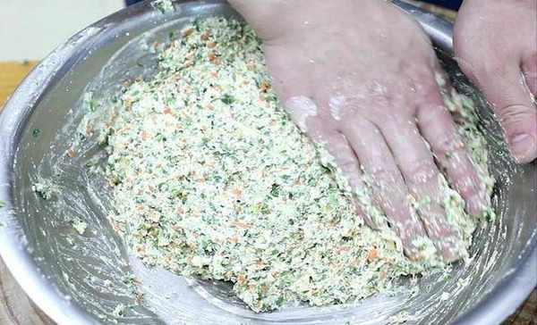 2.把食材全部放入盆中,加入适量的食盐、味精、鸡粉、蚝油、十三香调味,少许白糖,打入两个鸡蛋,把调料打散,最后加入适量的面粉增加抱合力,把馅料调至一抓一团就可以了。