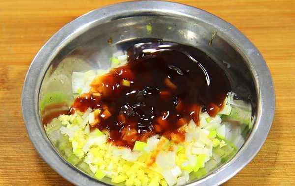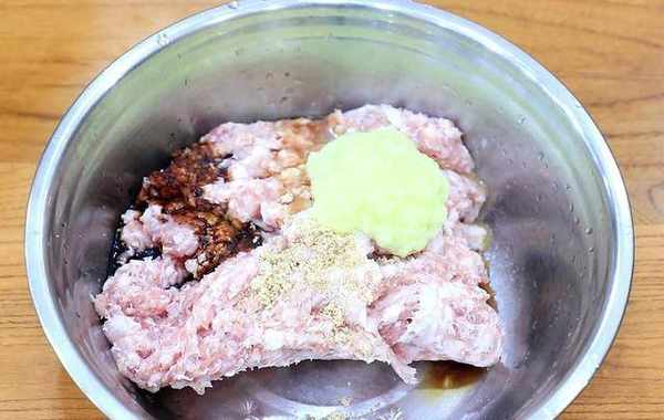 3.倒入刚才打好的葱姜水,顺着一个方向搅拌摔打,使肉馅吸收调料,再次加入葱姜水,搅拌出猪肉的胶质,这个搅拌时间要持续3分钟,再次加入葱姜水,再次搅拌3分钟,肉馅多次吸收葱姜水,散开的肉馅逐渐成团,放入马齿苋搅拌均匀。