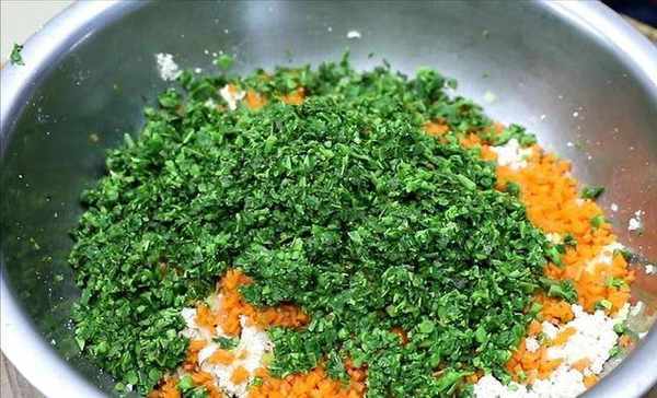 1.准备适量的荠菜,清洗干净切成小段,用开水烫一下,倒出快速用凉水冲洗一下,控水备用,剁成碎,这样更容易释放香味;再切点葱花、姜末、胡萝卜粒。