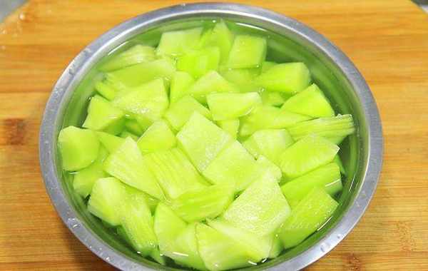 1.准备新鲜的莴笋一根,把叶片摘掉,切成7厘米左右的长段,削净外皮改刀成均匀的小块,放入清水中浸泡5分钟,这样莴笋的口感会更加清脆。