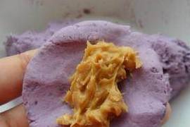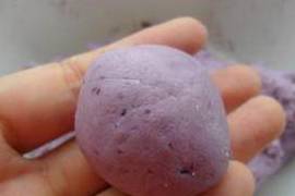 原料:紫薯、糯米粉(紫薯和糯米粉的比例是2:1),四季宝的颗粒花生酱