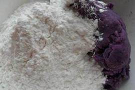 3、紫薯泥中加入糯米粉,倒入清水揉成面团(水要分次少量的加入,直到把紫薯泥和糯米粉完全糅合在一起)。