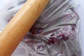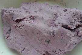 2、去掉紫薯皮,把紫薯放入保鲜袋中,用擀面杖碾压成泥