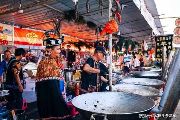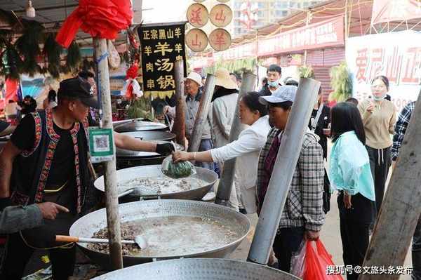 在美食羊汤锅一条街上,数十口大铁锅依街而摆,蔚为壮观,锅里翻腾着肥嫩的黑山羊肉,满街弥漫着诱人的香味。凡走进美食街的游客,几乎都无一例外地邀约朋友或家人一起,向店家点上一桌以“羊汤锅”为主菜的彝家美味佳肴,在铺满松毛的地上临席而坐,感受节日的氛围,分享人生的快意。