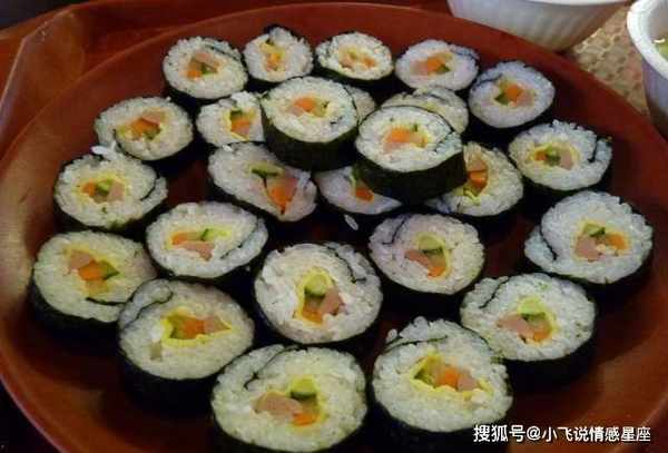 2.米饭的量和包在米饭里的材料可以根据个人喜好增减。也可以加入沙拉酱、千岛酱或番茄酱,再加一点肉松调味。3.用紫菜擀米时,竹帘容易粘上很多米粒。清洁时,可以将其浸泡在水中半小时。米粒已经肿胀了,此时会更容易清洗。