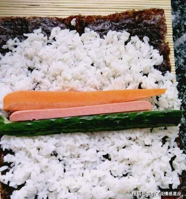 第一步:将胡萝卜洗净切薄片,放入沸水中焯水1分钟(除了切碎外,还能一定程度上去除部分胡萝卜腥味)。黄瓜去皮,切成细条,长度与紫菜的宽度相同;将火腿三明治切成细条;鸡蛋用半茶匙盐打散,搓揉厚皮,晾凉后切成1厘米宽的细丝。