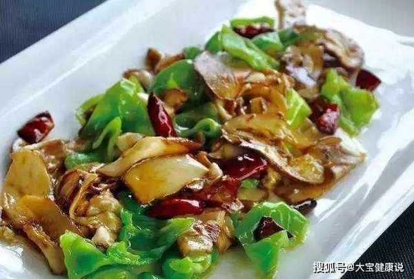 材料:姬松茸360g、红辣椒50g、青椒20g、盐适量、淀粉1匙、味精少许