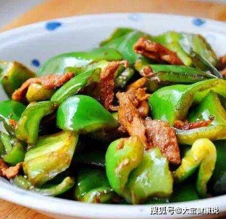 材料:青椒2个、猪肉50克、大蒜2瓣