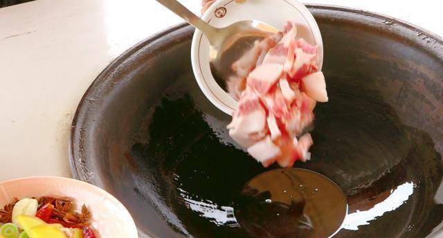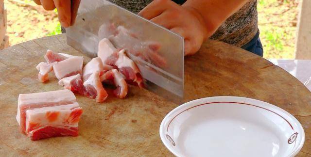接下来,将事先准备好的新猪肉切成薄片。切的时候可以看到肉上的纹路。你不能沿着线切割。如果按照台词做,煮出来的猪肉会很老。