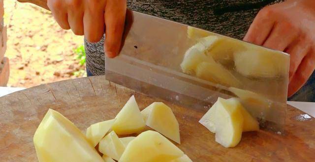 然后将土豆切成滚刀块。要知道土豆中所含的维生素B比苹果高3倍,所含的维生素C比苹果高9倍。其他微量元素,如磷、钾等,也远高于苹果。