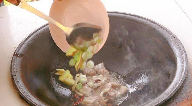 猪肉煮熟后,加入葱、姜、蒜和胡椒粉,一起翻炒。