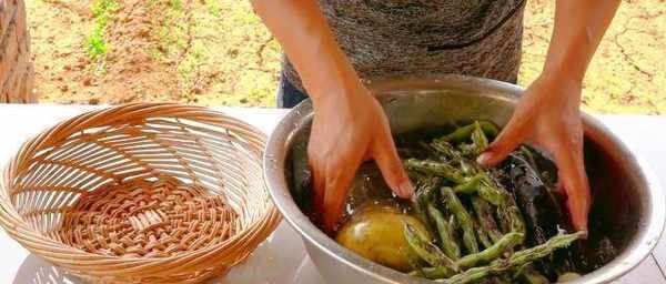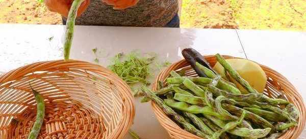 先把豆子切丝,土豆去皮,茄子去蒂,装在筐里待用。