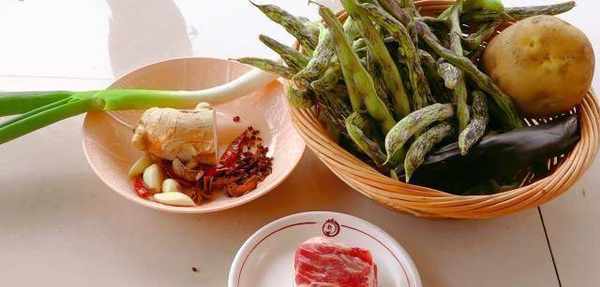 准备食材:豆角、茄子、土豆、鲜猪肉、小葱、蒜、姜、花椒、花椒、八角。