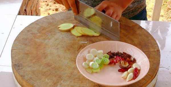 配料处理好后,再处理辅料,大蒜切片,大葱切圈,辣椒切碎,姜切片,装盘待用。