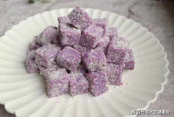 4、将煮好的紫薯糊倒入容器中,抹平表面,放凉后放入冰箱冷藏1小时。冷却至变硬后,将其取出,切成小块,然后将其包裹在一圈磨碎的椰子中。食用。