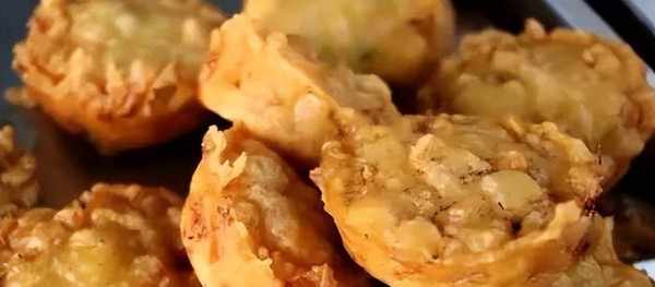 3、 把上面介绍的铁柄盏放入油中略炸一下,然后拿出来。放入馅料,再加入粉浆,注意不要加太多。放入油中,大火爆炸。炸到成型后把铁柄盏拿出油锅。把猪脚圈炸至金黄色就可以了。