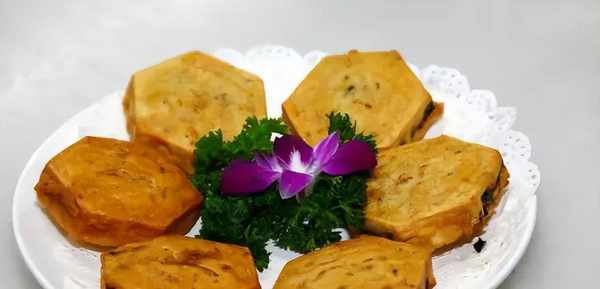 2、 准备馅料。馅料可以用韭菜、萝卜丁、芋丁、土豆……你想吃什么就加你什么,一般没有太大要求。把上面这些材料切成丁,然后拌上适量的五香粉、白糖、盐即可。