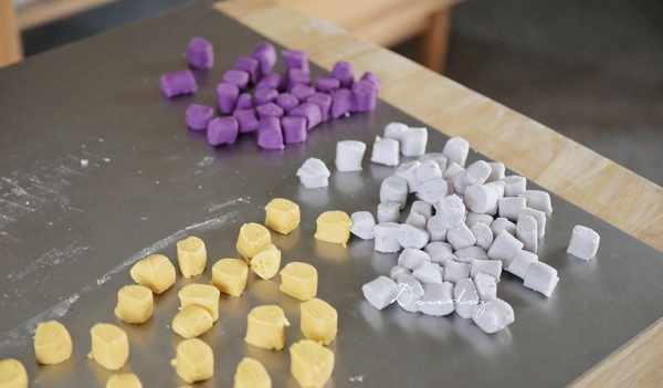 4、把食材全部处理好揉成团就可以开始来制作了,制作时最好以颜色划分来制作。先制作浅色然后才是深色,避免混色影响美观。