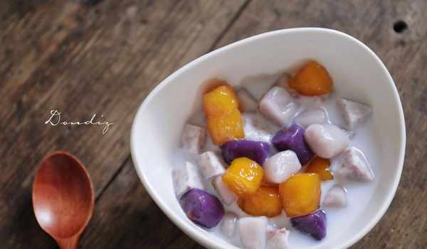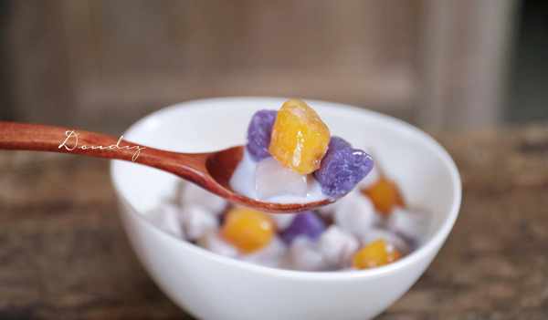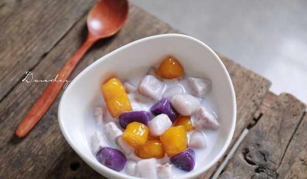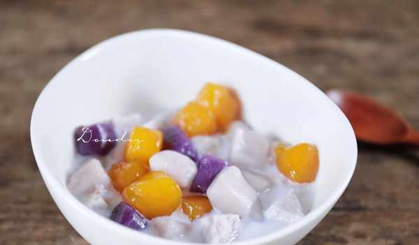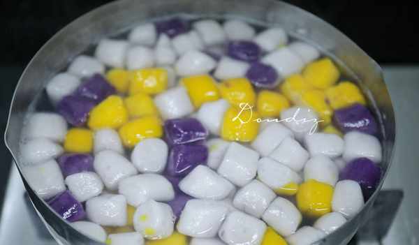 7、煮芋圆时要待水开才能放入锅中煮,煮至芋圆浮出水面即可捞出。春季时可以煮了搭配热椰汁或牛奶,口感软细非常香滑。夏天时煮好的芋圆可以捞入冰水中让收缩一下口感比较Q弹,然后倒一些香芋丁倒入冷藏过的椰汁即可。