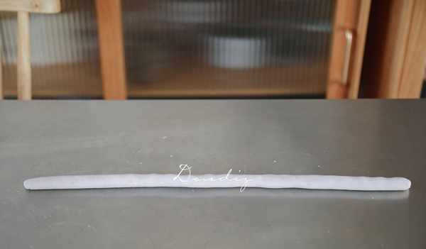 5、取一小块“面团”捏一捏像玩黏土一样,按压搓揉成条具体粗细自行决定。