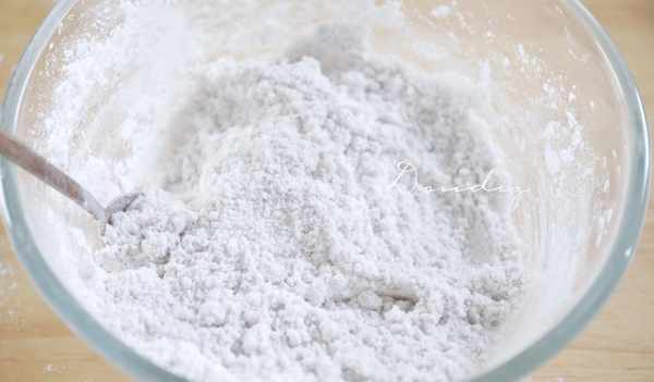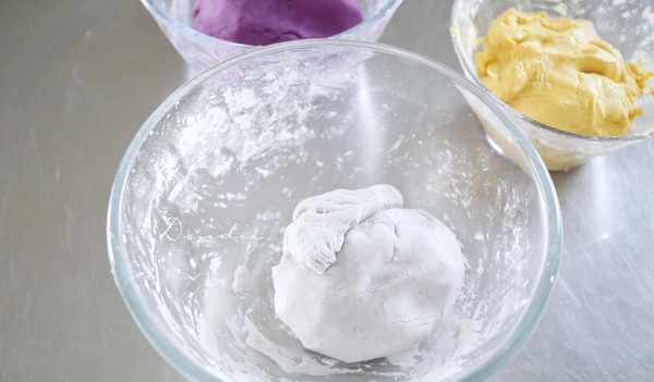 3、接着分别向三个盆三个口味加入各250克的木薯粉,以1:1的比例搭配混合。木薯粉可以多一些但不能少,木薯粉比例太少不仅不好搓形口感也会比较差。在混合的这一个步骤里要注意食材的特性,香芋和紫薯含水量很低并且质感太松所以必须先行拌匀然后再加入大致60克的热水进行搅揉成团具体操作视实际情况决定。至于南瓜,它的含水量很高基本上不需要再额外加水。