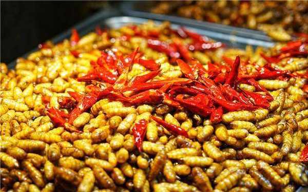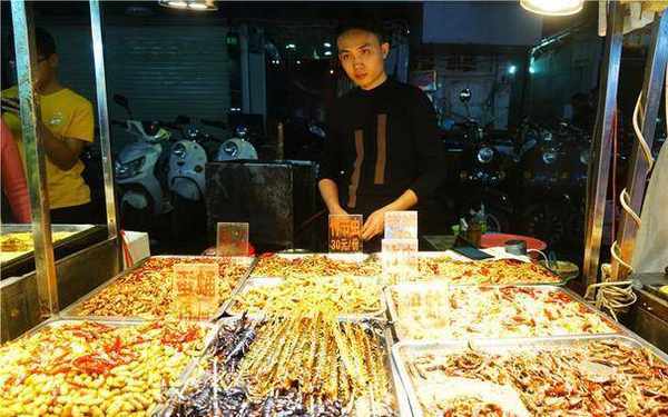 在小吃摊上,最吸引人眼球的莫过于各种油炸昆虫了,外观吓人的蝎子、蜈蚣,还有蚕蛹、知了,蝎子蜈蚣都是30一个,据摊主介绍,这些全部都是人工养殖,富含蛋白质、口感细腻香甜。这道小吃十分具有挑战性,有的人十分享受,有的人看到了就掉头就走。