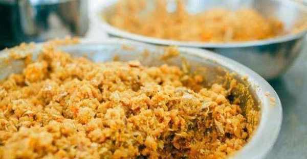 ◆加入蟹黄、蟹肉等多种配料,冷却至低温成冻状;