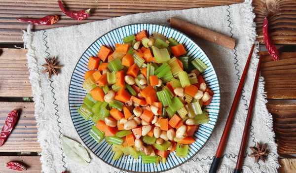 4.捞出花生后继续放入西芹丁、胡萝卜丁焯熟
