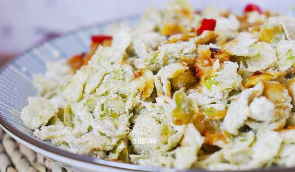 3.注意榆钱一定要拌到干为止,面太少,榆钱饭容易变浓不好吃,拌入干面粉,翻一翻,使每一个榆钱上满都沾上面粉。