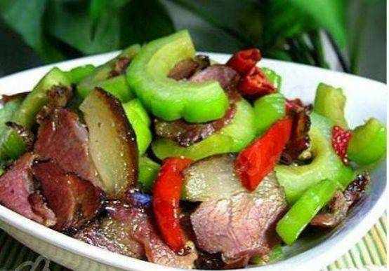 3、锅中倒入油烧热;将腊肉倒入锅中翻炒,不断搅拌,直至脂肪变透明;