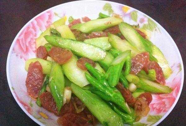 2.将大蒜切成细末。锅内放适量油,烧热至60%,加入一半蒜末爆香。将广式香肠加入锅中,煮至半透明。将羽衣甘蓝放入锅中,快速搅拌直至羽衣甘蓝煮熟。加少许盐调味。加入剩余的蒜末并搅拌均匀,然后从锅中取出。