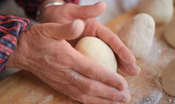 3、如果实在不知道面团熟了没有,撕开面团看一下就可以了。如果能清楚的看到“蜂窝”状,说明面团已经发酵好了。将面团转移到砧板上,揉至放气,分成球,放入馒头中。