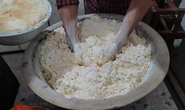 2、面粉搅拌均匀,然后将酵母水倒入面粉中,用筷子不断搅拌,直到里面几乎没有干粉,然后揉成面团。面团发酵好了,不用说了,盖上盖子转移到温暖的地方发酵至两倍大。
