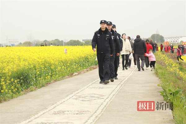 在油菜花海周边道路,极目新闻记者看到执勤民辅警紧盯高峰时段、重点路段,对景区的人流、车流进行快速疏导,指挥游客车辆有序停放。在张池农耕文化体验园景区演出舞台、赏花步游道、观景亭、特色农产品和小吃展销区等重点部位,执勤民辅警开展多时段交错巡逻,及时为有需要的游客提供服务、解决困难。