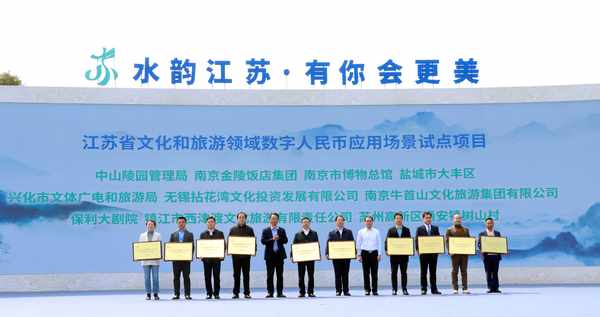 钟山风景名胜区、南京金陵饭店集团、南京市博物总馆、盐城大丰区、泰州兴化市、拈花湾景区、南京牛首山文化旅游区、保利大剧院、西津渡中央休闲区、苏州高新区通安镇树山村等10家“江苏省文旅领域数字人民币应用场景试点项目”单位获授牌。