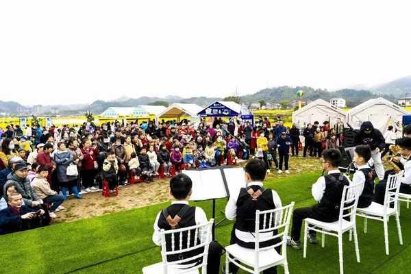 油菜花海中的舞台,正上演着精彩的歌舞节目,乐队、舞蹈、古筝轮番上台,让在场观众看得目不转睛,纷纷拿出手机记录精彩瞬间,博得了大家一阵又一阵的掌声。