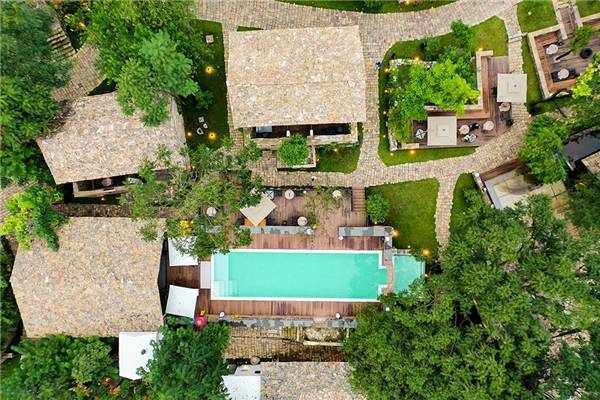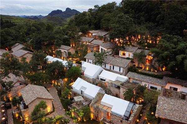 第二个项目“村晓”,则是匠庐投入最多的项目。那原本是一个小山顶上的布依族的村落,用石头堆砌而成,但已经空心。花了两年多的时间,这个村落被复活了,古老的房子仍然在原来的位置上,没有去改变原有的村落关系,外观也保持了尽可能多的原貌,比如石头片做的屋顶,石头砌的墙,但新的公共空间赋予了这个村落新的意义,酒吧、泳池、spa馆、传统手艺馆、禅房、茶屋、亲子乐园……而老房子的内部也变得更加舒适。“住这里的人都是为了度假的”来自北上广深的客人,去景区则成了整个假期里的一个安排环节,而在村子里呆着,则占据了更多时间。