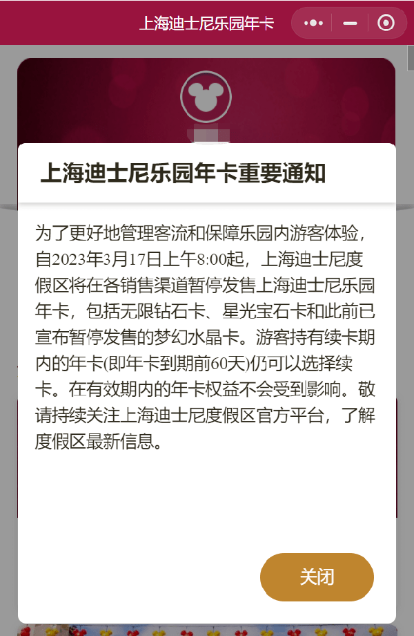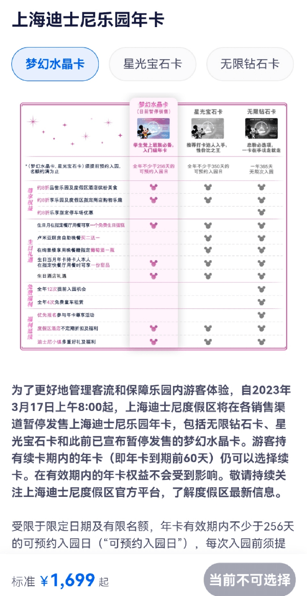 3月17日上午,“上海迪士尼乐园年卡”小程序发布通知,为了更好地管理客流和保障乐园内游客体验, 自2023年3月17日上午8时起,上海迪士尼度假区将在各销售渠道暂停发售上海迪士尼乐园年卡,包括无限钻石卡、星光宝石卡和此前已宣布暂停发售的梦幻水晶卡。