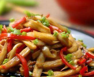 配料表:杏鲍菇、红辣椒、姜葱、蚝油、老抽、盐、糖、麻油