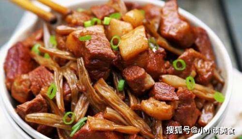 材料:五花肉450克,干豆80克,冰糖5粒,香叶3片,八角1片,桂皮1小块,料酒3茶匙,生抽3茶匙、红烧酱油3茶匙、葱姜各适量、盐适量
