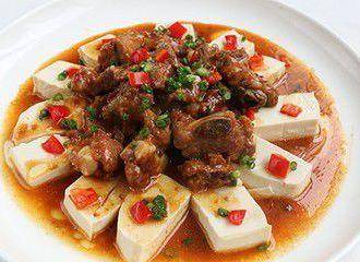3、将豆腐和猪骨拌匀,起锅蒸30分钟左右,捞出撒上葱花和红辣椒装饰。