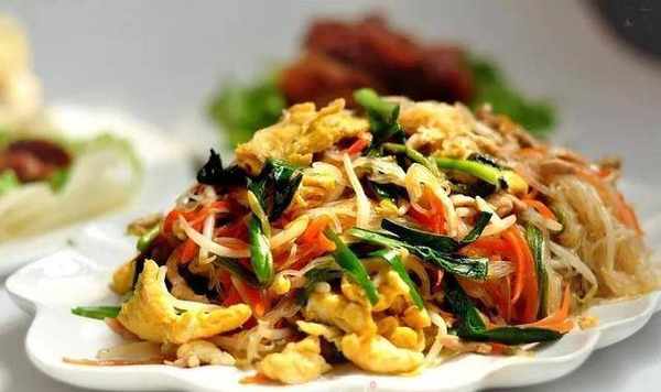材料准备:韭菜1小把,绿豆芽100克,鸡蛋1个,红薯粉200克,胡萝卜条适量,生抽1汤匙,老抽1汤匙,白糖适量,少许盐;