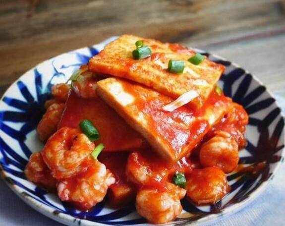 材料:大虾150克、豆腐500克、小葱3粒、番茄酱、白砂糖、盐、淀粉