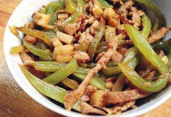 5、然后加入炸好的肉丝,翻炒均匀,加盐和鸡精调味即可上桌