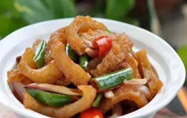 做法:1、将炸好的猪皮放入沸水中煮沸,然后用清水浸泡数小时,直至猪皮膨胀并富有弹性;