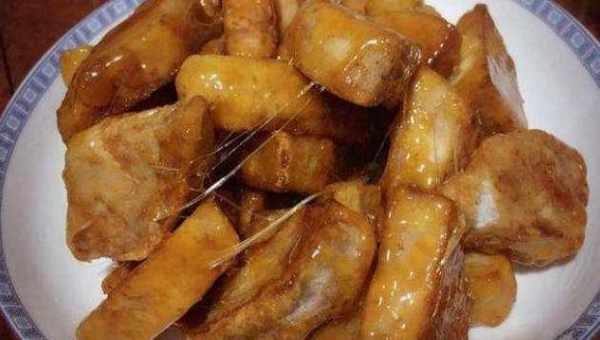 4、锅内留少许底油,肉热时加入糖,小火炒至糖起泡,倒入炸好的芋头,搅拌至芋头均匀裹上糖。