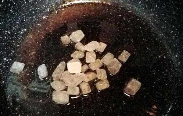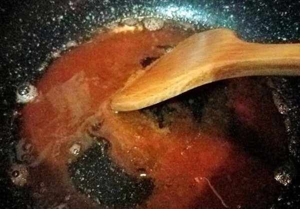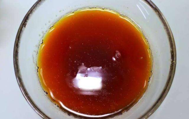 如果炒糖色不是马上炒出来的,而是保留了炒糖色,我们需要在糖色中加入适量的热水。如果直着放,温度下降后糖和油会分离,以后很难涂抹。加入热水后,不粘手,糖的颜色也能很好地保存下来,以备下次使用。